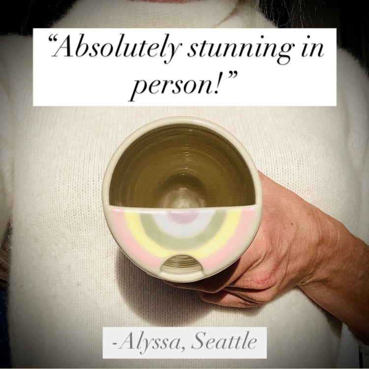 Your Myndset sparkles and shines with this feel good happy travel tumbler. Featuring a vibrant handprinted rainbow that symbolizes hope and positivity, this tumbler is designed to fit perfectly in your hands with its smooth finish and uplifting color tones. Made on the potter's wheel of local clay with a happy reminder, this tumbler ignites your spirit and sets the stage for a more productive, fulfilling life. The one of a kind rainbow tumbler is hand painted in multiple coats and made in very limited-edition batches that frequently sell out.