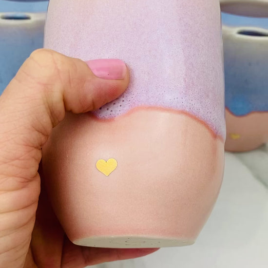 Rare luminescent ceramic travel mug in Aura: a limited, otherworldly reactive pink glaze with a halo. This new star on the block is a one of a kind magical duotone glowing color with a gradient of opacity, depths of color you can look into as deep as a pink sunset, and a drippy glaze that dances while it’s molten, making each piece truly unique. Featuring a glowing halo around the rim, this mug has an ocean-like feeling that you can look for at hours mesmerized by its deep hues, like the mysterious opal. This special travel mug also boasts two finishes: a satin pink interior covered by a glossy pink overlay for duo-texture.