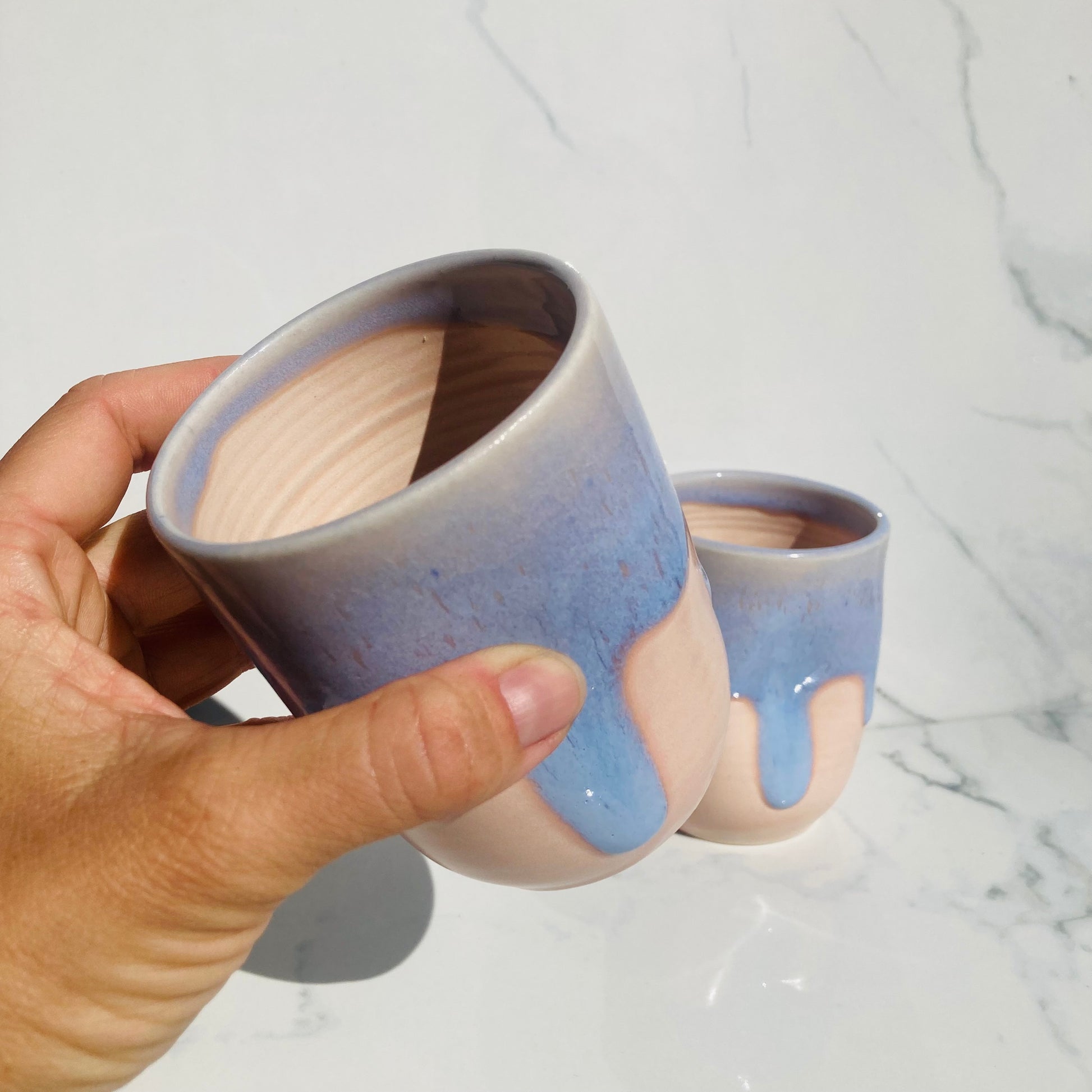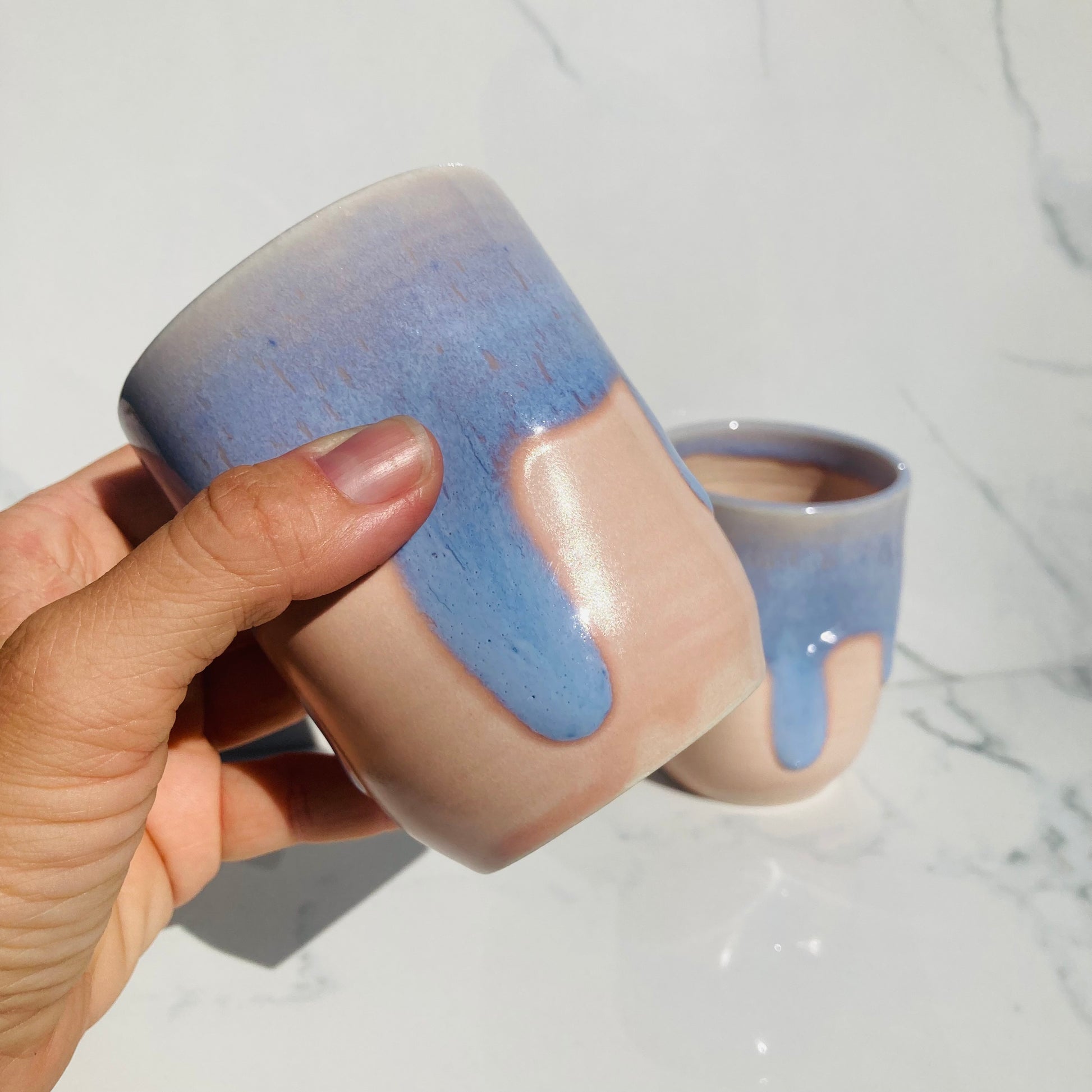 Meet your new favorite tumbler — the Stardust Ceramic Tumbler, where soft blush clay meets a dreamy, hand-poured blue glaze that drips and pools like twilight clouds across a quiet evening sky. Every piece is one of a kind, with its own unique glaze pattern and hand-sculpted thumbprint designed for a naturally cozy, intuitive grip.
